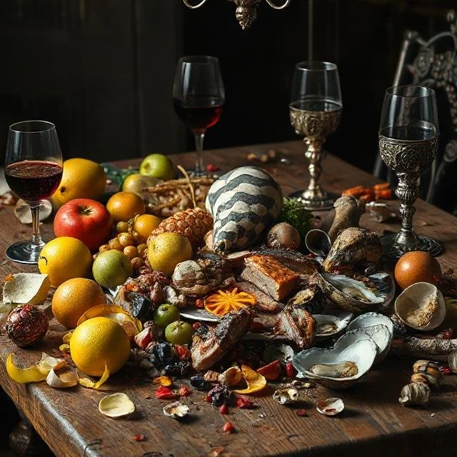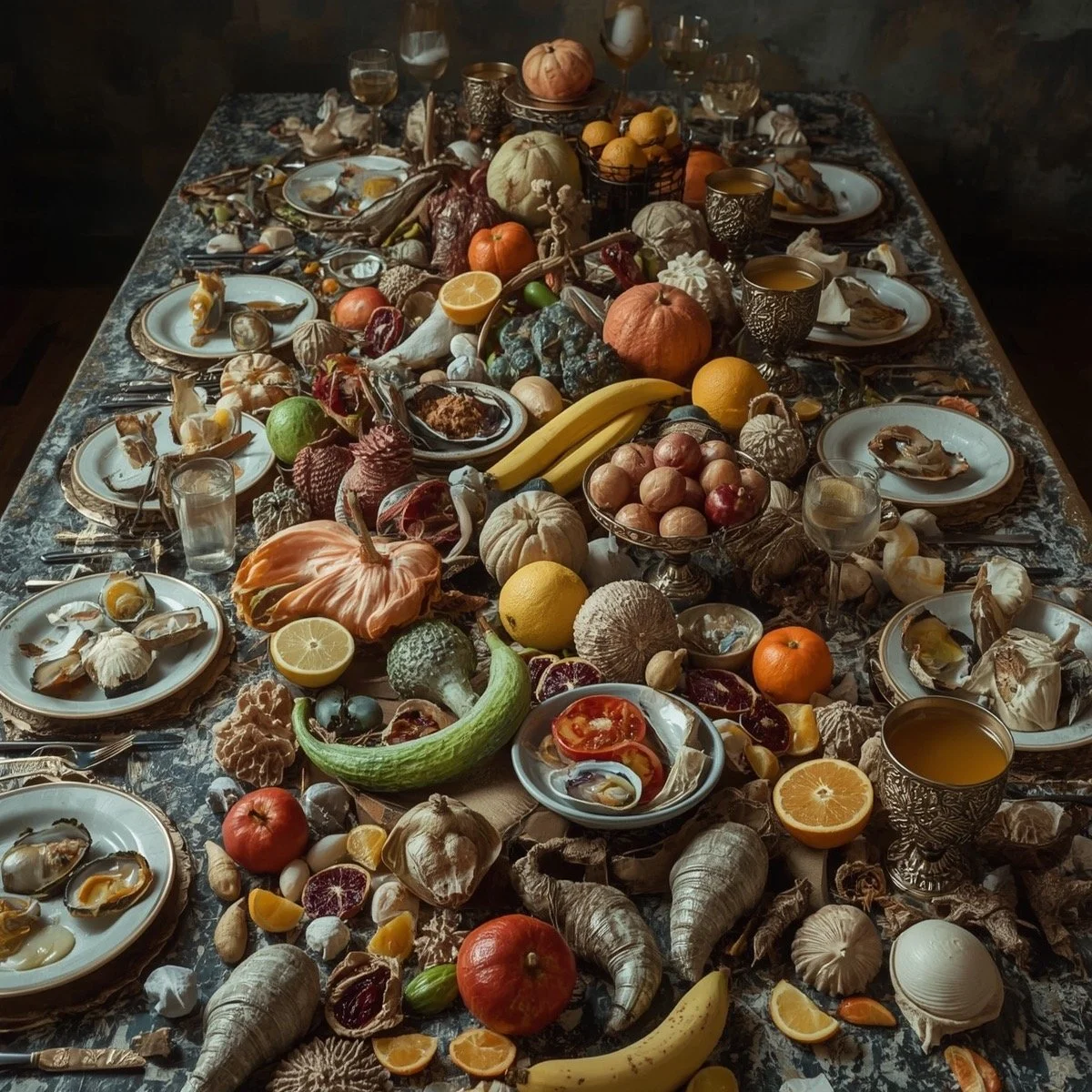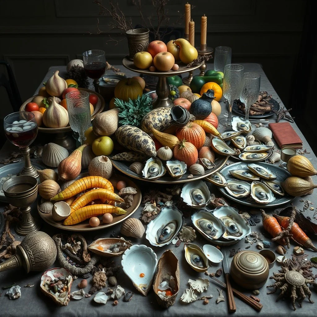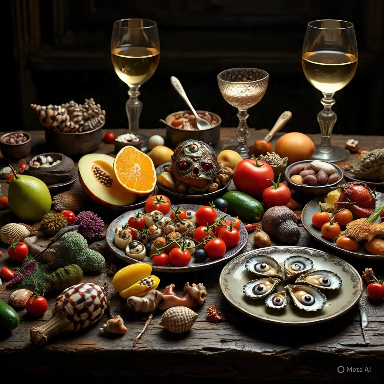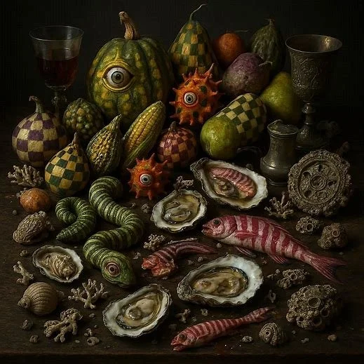 Thanksgiving is around the corner… Here are a mix of renaissance feasting tables + my warped ai mutation prompts which include fruit, veg (made-up, deflated, mutated, etc.) and some sort(s) of seafood. There’s plenty of work yet to be done for these to become more realistic though the heavy mood is there. Meta seems to have added a scary main course and bing has found Beetlejuice inspiration— neither with my help—where did that all come from?!